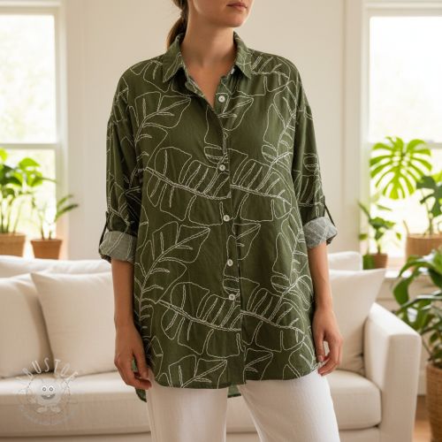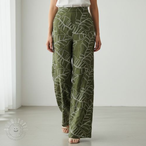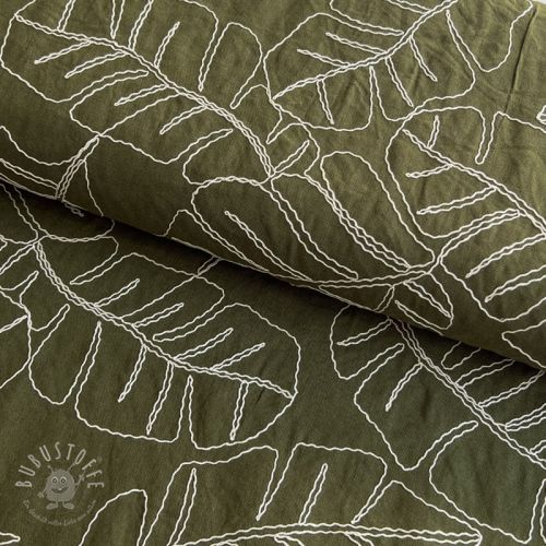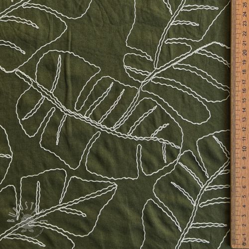 Viskosestoff leinen EMBROIDERY Leaves forest green
